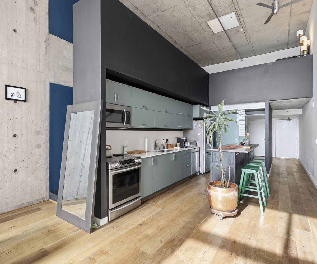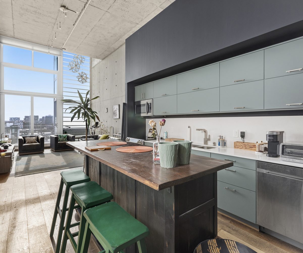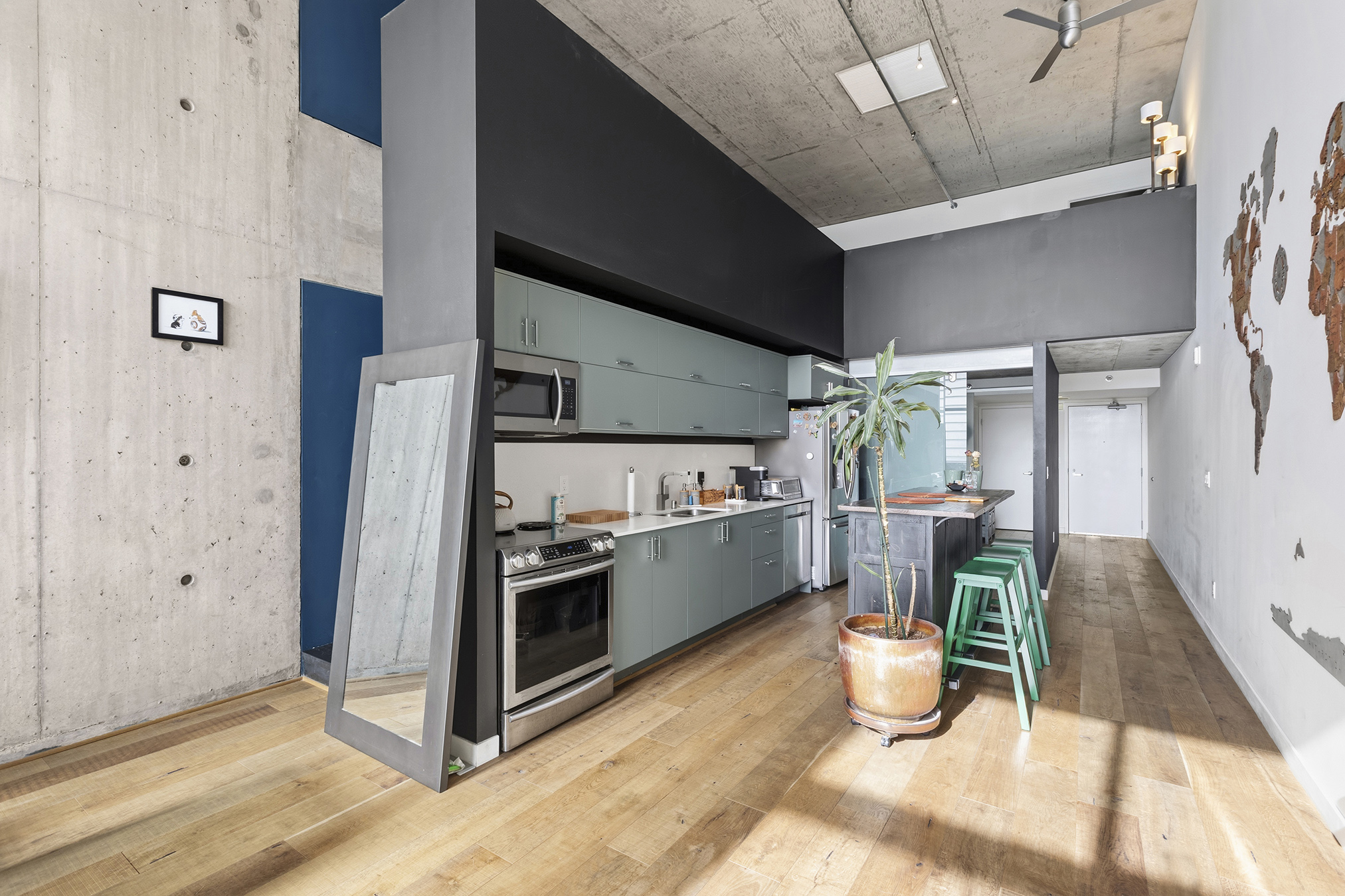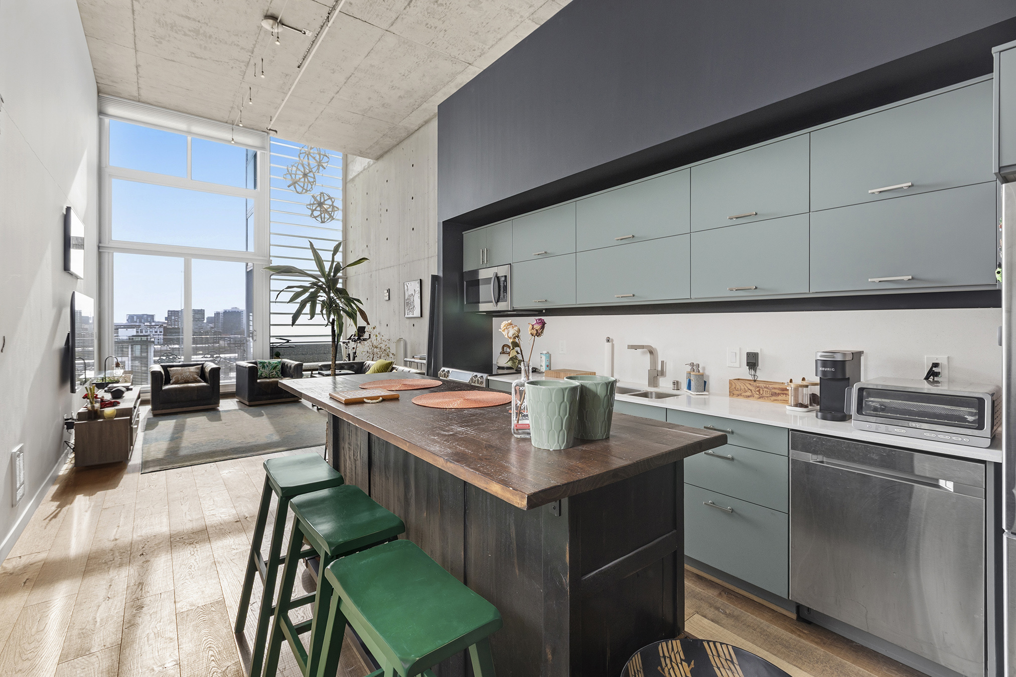HIGH-END FINISHES: Beautiful natural concrete, upgraded wood floors, sliding custom glass doors, designer paint throughout, custom window coverings, designer lighting, stair treads & a ceiling fan. The kitchen is upgraded with redone cabinet surfaces, a newer updated stove/oven, dishwasher, refrigerator, washer/dryer, granite countertops, and modern stainless steel appliances, and other high-end finishes throughout! Deeded parking and separate storage!