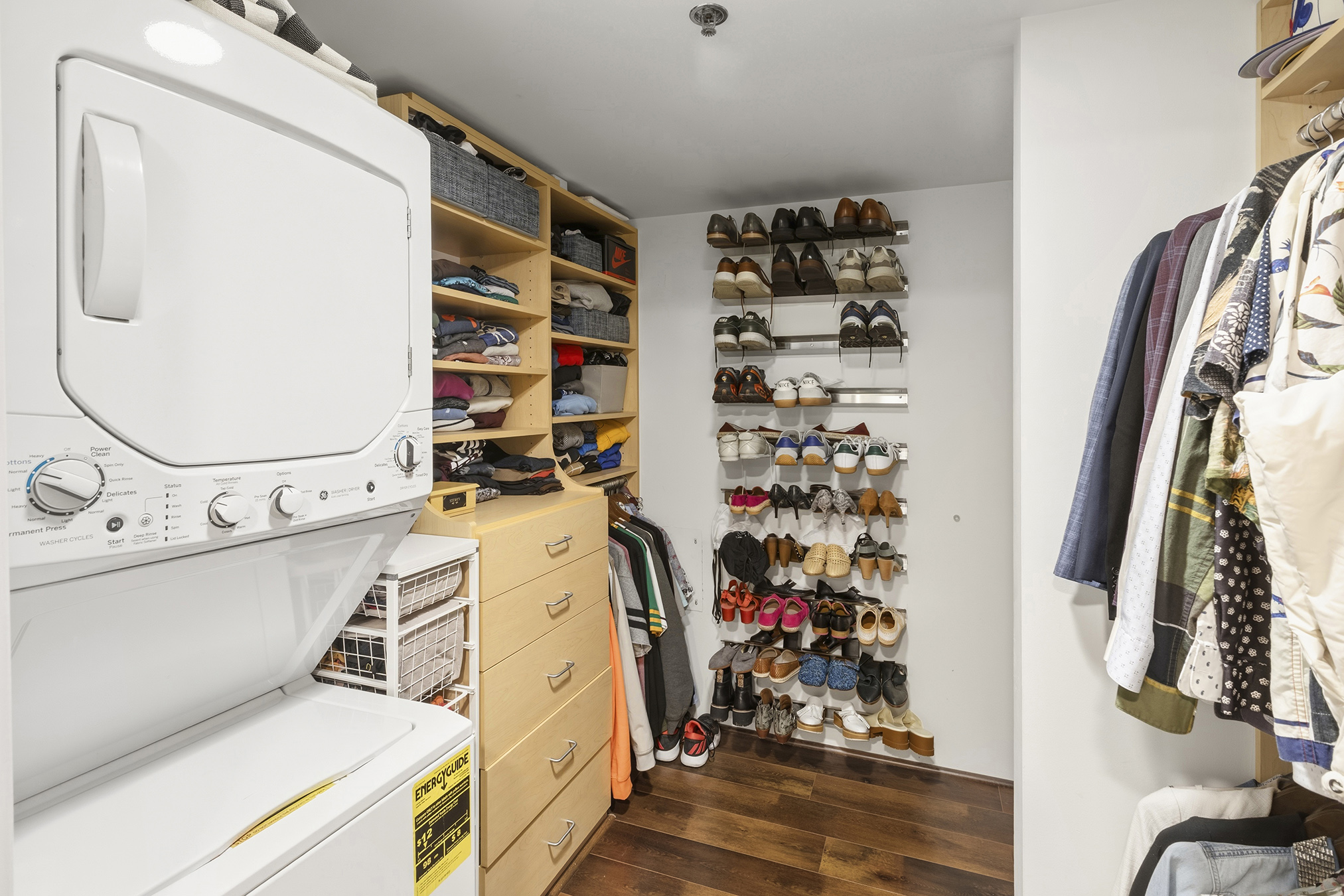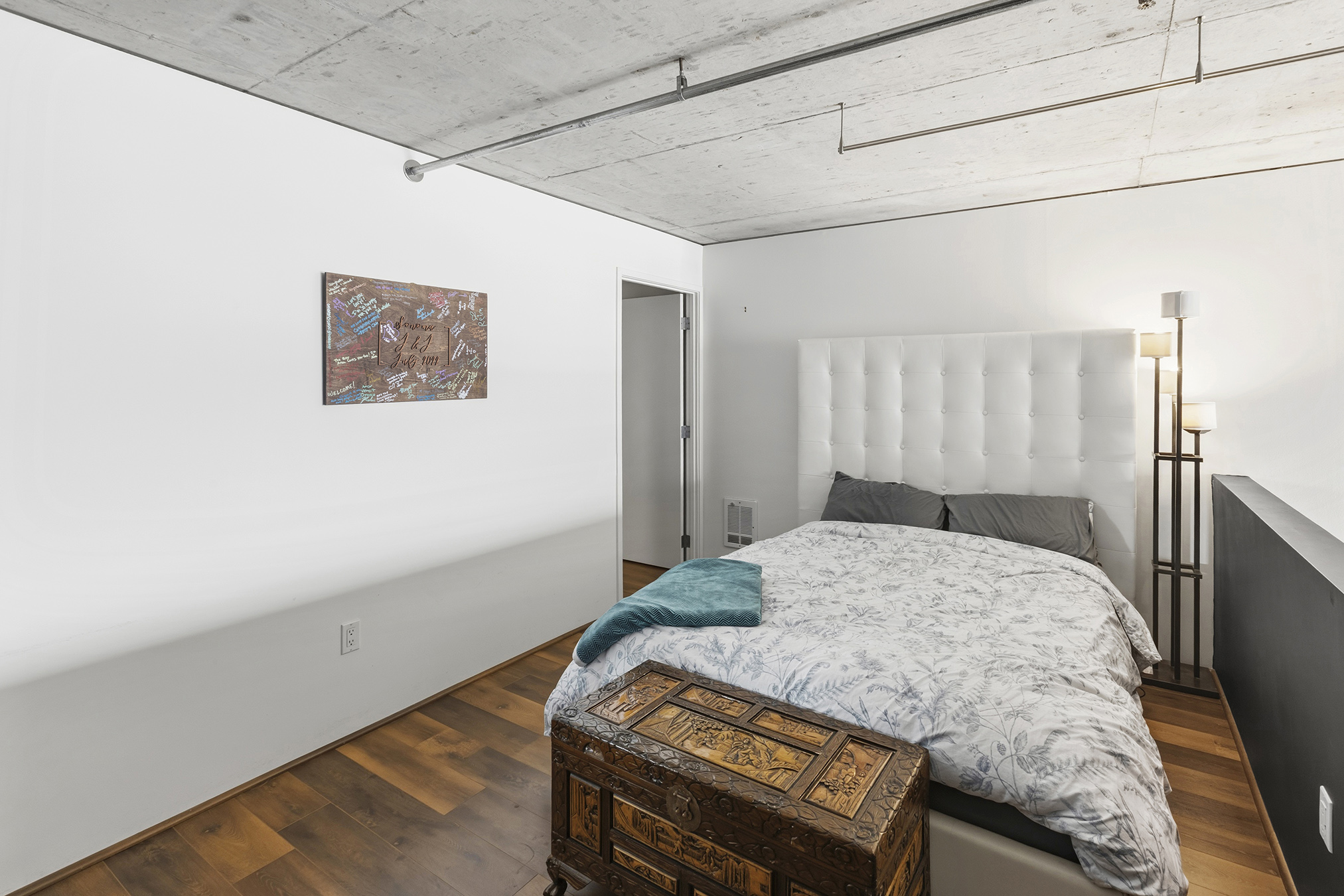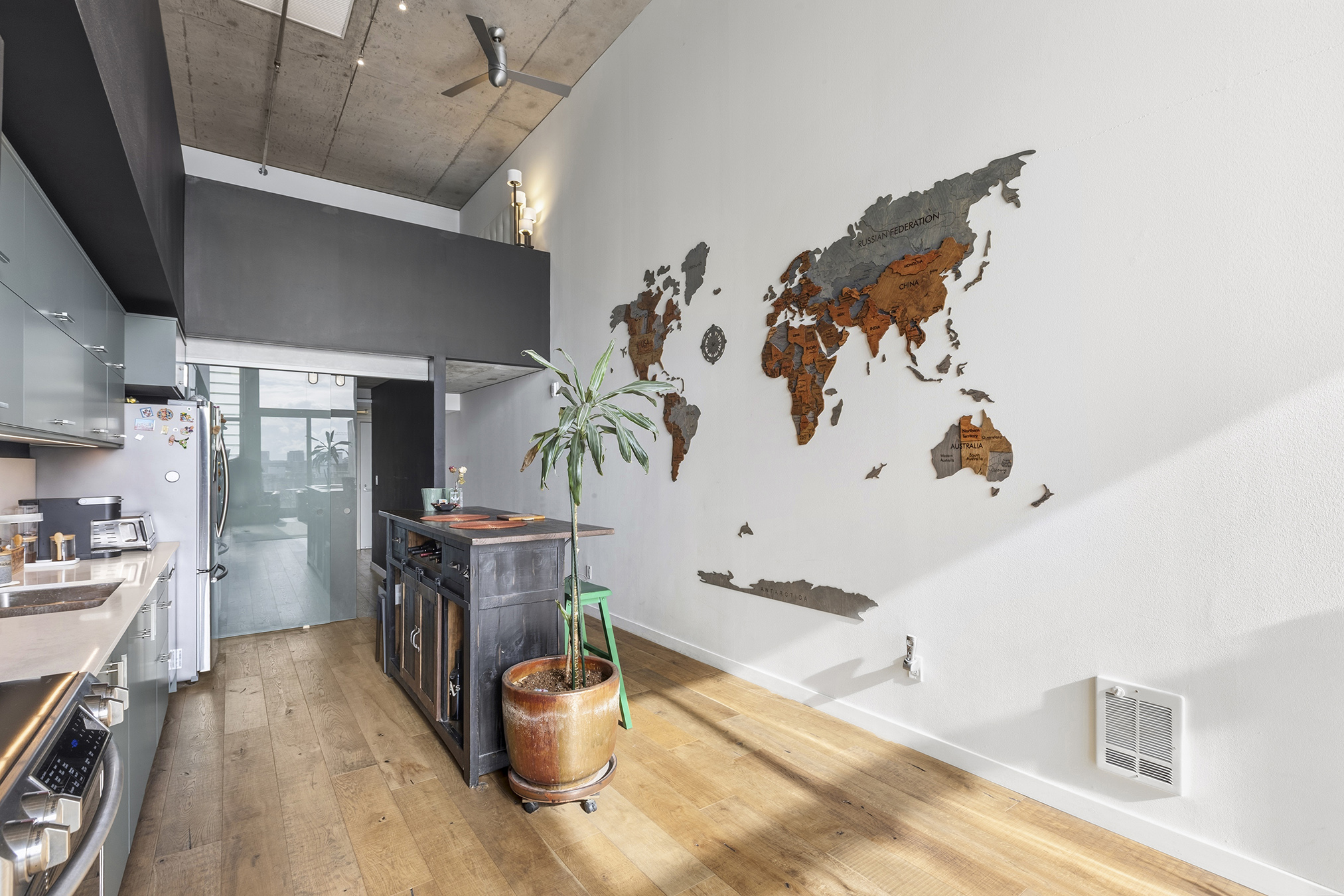 HIGH-END FINISHES: Beautiful natural concrete, upgraded wood floors, sliding custom glass doors, designer paint throughout, custom window coverings, designer lighting, stair treads & a ceiling fan. The kitchen is upgraded with redone cabinet surfaces, a newer updated stove/oven, dishwasher, refrigerator, washer/dryer, granite countertops, and modern stainless steel appliances, and other high-end finishes throughout! Deeded parking and separate storage!